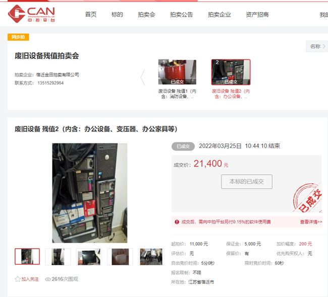 3月25日上午10時(shí)30分,開發(fā)公司一批廢舊辦公設(shè)備、辦公家具、變壓器等物資在中拍平臺(tái)公開拍賣,7家競(jìng)買人,經(jīng)過(guò)14分10秒緊張激烈競(jìng)價(jià),最終以21400元成交。